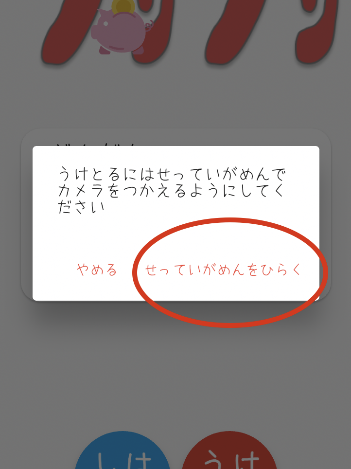 このがめんがひょうじされたばあいは「せっていがめんをひらく」ボタンをおして、せっていがめんでカメラをオンにします