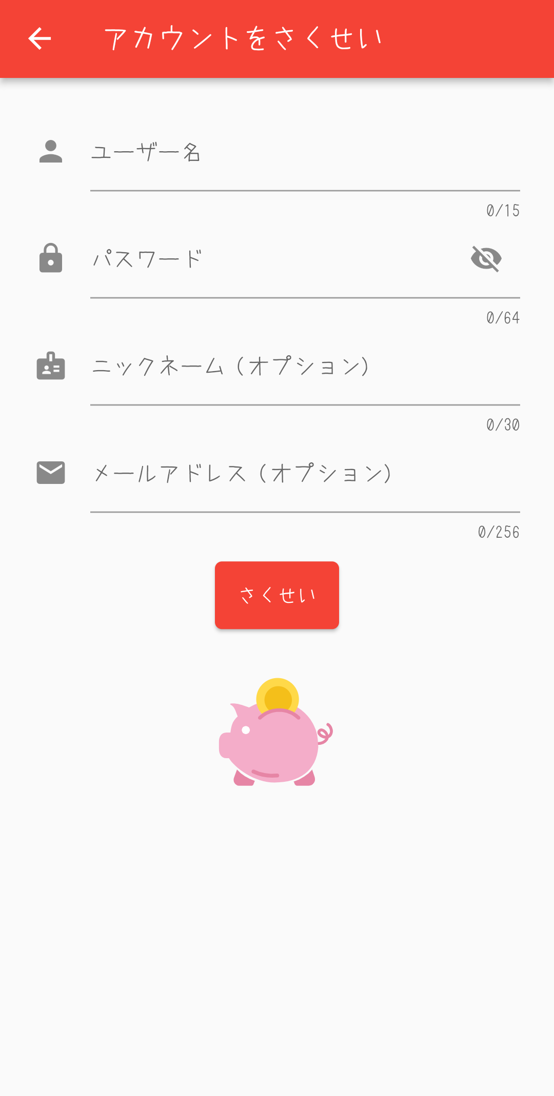 2. 「アカウントをさくせい」がめんから ユーザー名、パスワードを入力して「さくせい」ボタンをおします