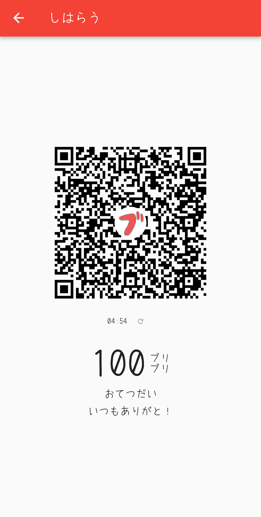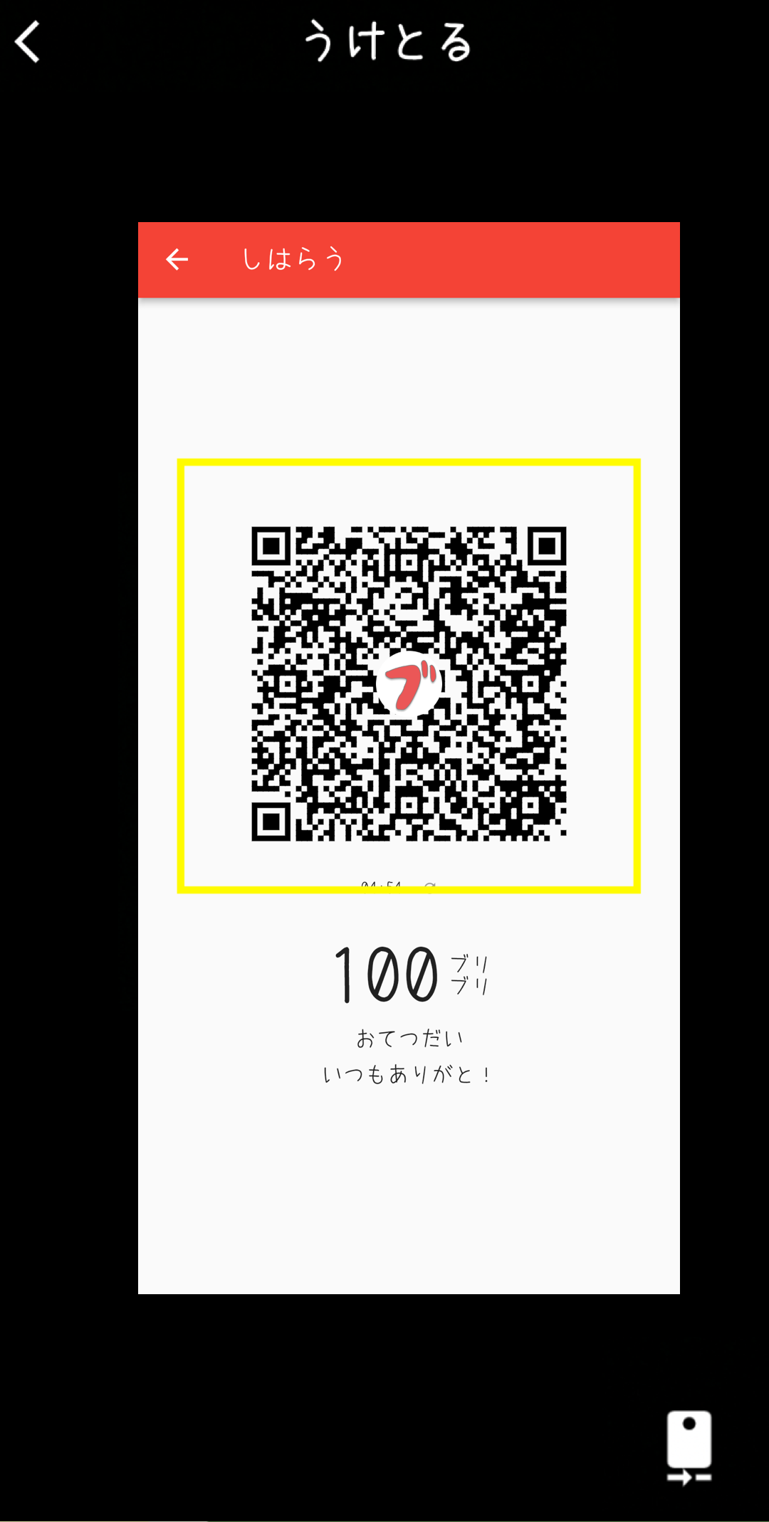 4. QRコードがひょうじされますので、おこずかいをうけとるかたのスマートフォンのブリブリアプリからうけとりしてください