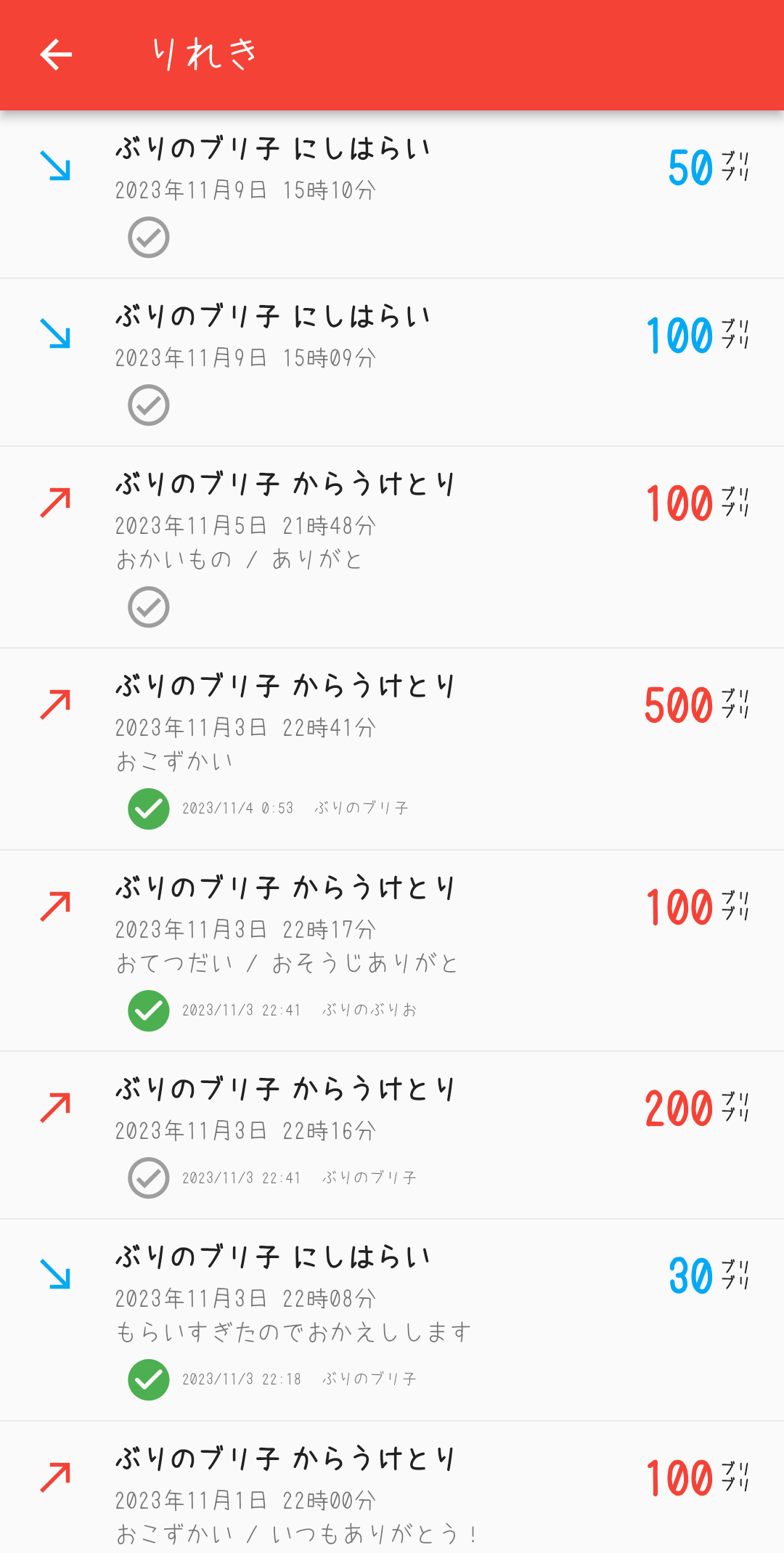 我が家ではお手伝いごとにブリブリで報酬を支払い、月末にはこれを現金に換金しておこずかいとしています(1:1のレートで換金)。子供たちは数字で成果を確認できるため、お手伝いに積極的に参加してくれるようになった気がします。 お手伝いに金品を与える方針には賛否があるかもしれませんが、あくまで一例としてお考えいただければと思います。
